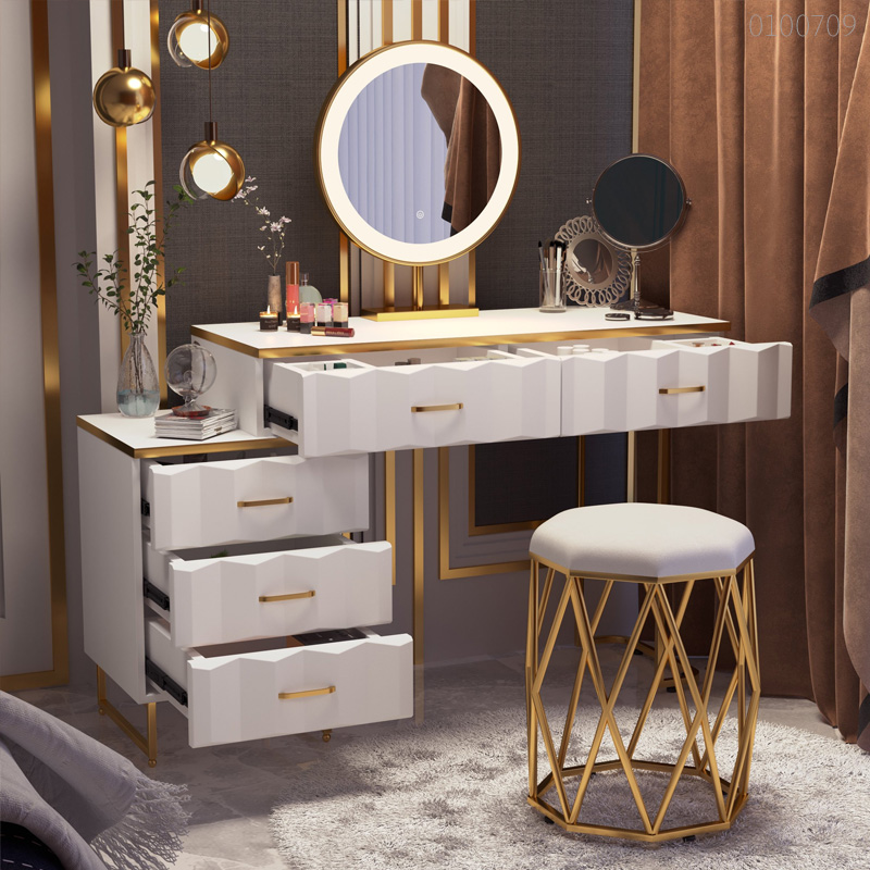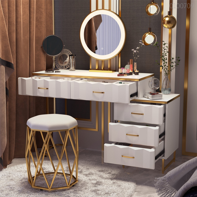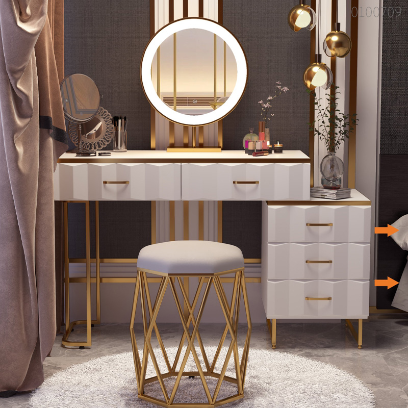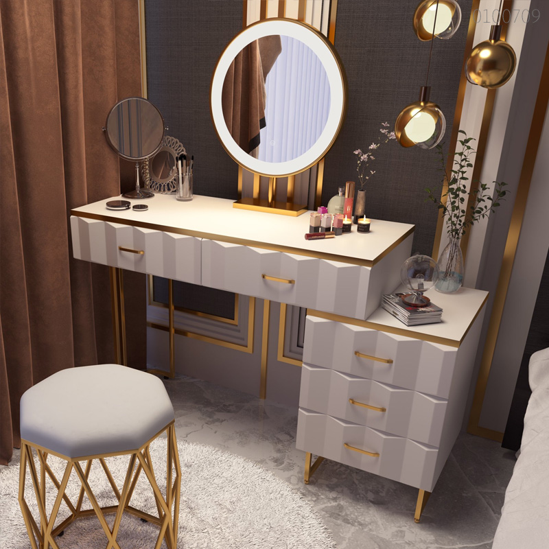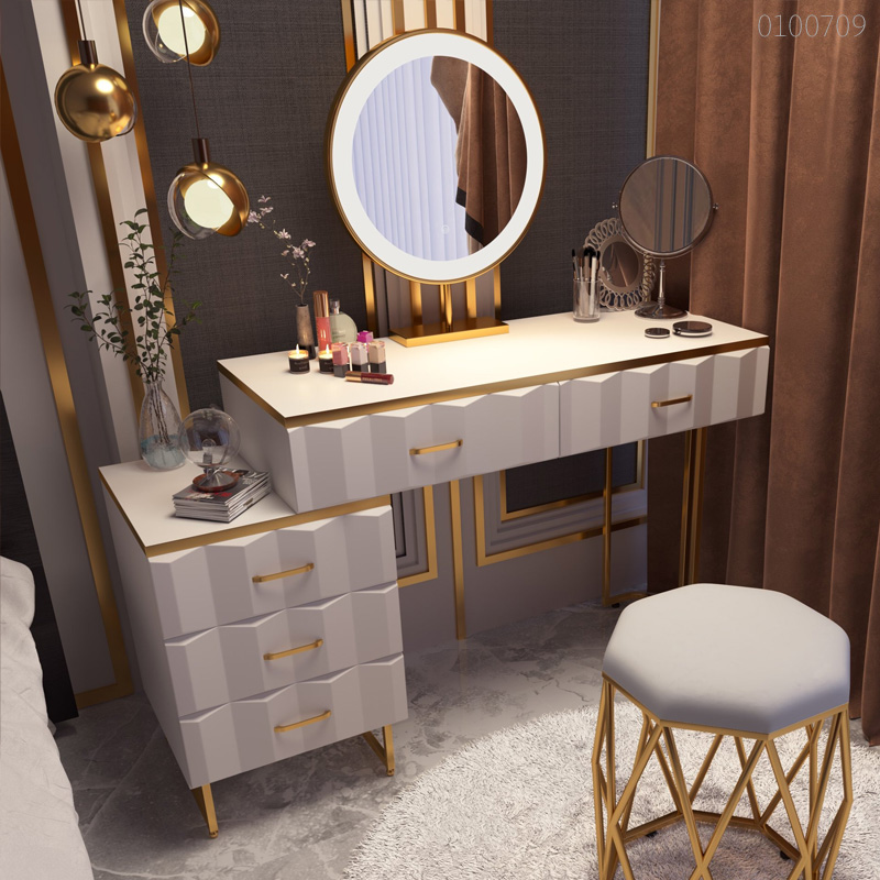 Một căn phòng ngủ master đúng chuẩn Modern Glam sẽ không thể hoàn thiện nếu thiếu đi trạm làm đẹp mang tính biểu tượng như Vito. Với cấu trúc module bất đối xứng và khung chân sắt vàng đồng thanh mảnh, mẫu tủ bàn trang điểm này chính là mảnh ghép cuối cùng giúp không gian của bạn bừng sáng.