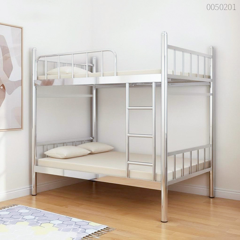Mẫu giường Holly nổi bật với kết cấu inox 304 vững chãi, bề mặt phản chiếu ánh sáng giúp phòng ngủ thêm rộng rãi. Cầu thang dạng thanh dẹt tích hợp dọc thân giường vừa tiết kiệm diện tích, vừa giúp việc leo trèo không bị đau lòng bàn chân. Tầng trên được bao bọc bởi lan can cao vừa vặn, giữ nệm cố định và đảm bảo an toàn cho người nằm. Hệ thống vạt nan dày cùng chân trụ bọc nút nhựa giúp giường đứng vững, không gây tiếng rít kim loại hay làm trầy xước sàn nhà. Đây là giải pháp lâu dài cho gia đình cần sự tinh khiết, dễ vệ sinh và khả năng chịu lực mạnh mẽ từ khung inox hộp dày dạn.