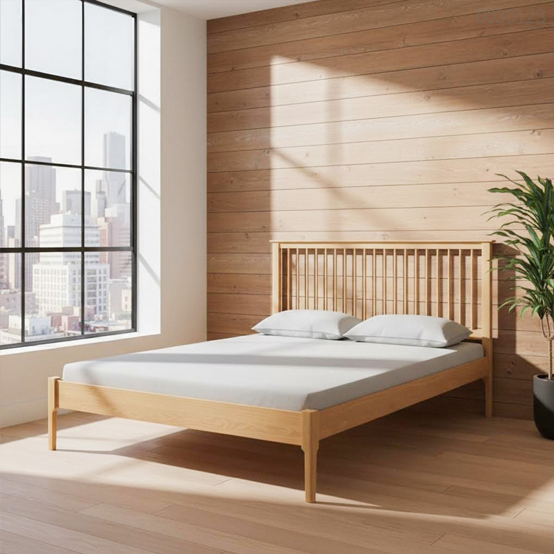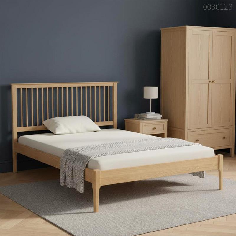 Giường ngủ gỗ sồi Explore mang đến diện mạo gọn gàng cho phòng ngủ nhờ hệ nan dọc ở đầu giường giúp ánh sáng và không khí lưu thông dễ dàng. Khung giường gỗ sồi khối giữ màu vàng sáng tự nhiên, hiện rõ những đường vân hình elip đặc trưng dưới lớp sơn PU mờ mịn màng. Các góc cạnh và chân giường được bo tròn, vát nhẹ tạo vẻ thanh mảnh nhưng vẫn đảm bảo độ chắc chắn, không rung lắc nhờ hệ vạt nan dày dặn bên dưới. Với thiết kế đuôi giường thấp và gầm cao thông thoáng, việc di chuyển hay vệ sinh sàn nhà mỗi ngày trở nên cực kỳ đơn giản. Đây là giải pháp thiết thực cho những ai cần một chiếc giường bền bỉ, mộc mạc và tinh tế.