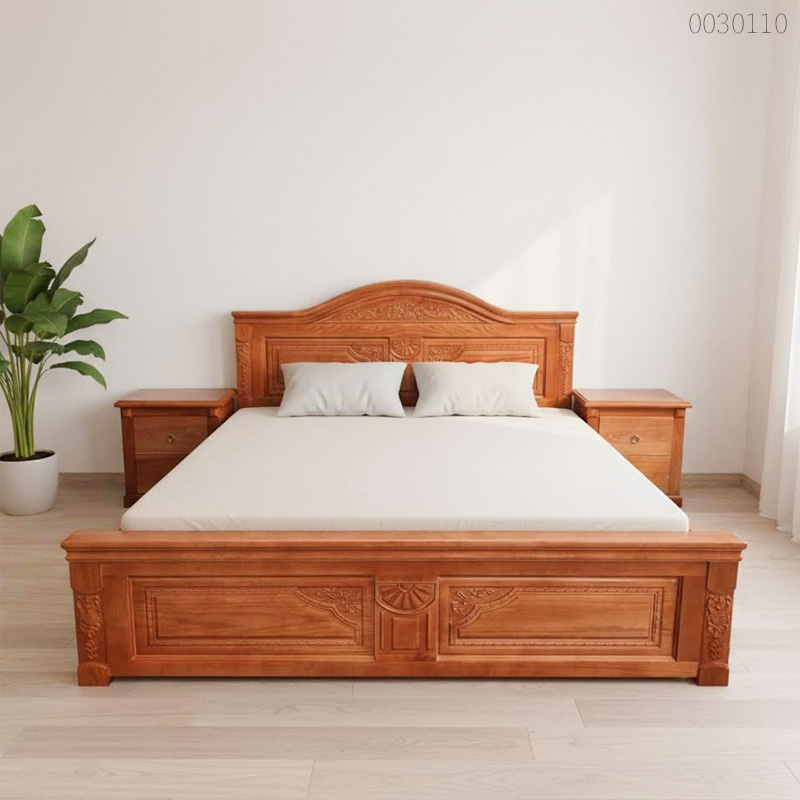 Giường ngủ gỗ sồi Koler gây ấn tượng bởi họa tiết cánh quạt chạm nổi cùng các khung ô vuông pano sắc nét tại đầu và đuôi giường. Thay vì kiểu dáng chữ nhật đơn điệu, thiết kế đầu giường uốn cong dạng vòm giúp không gian phòng ngủ trở nên thanh thoát nhưng vẫn đầy quyền uy nhờ hệ trụ cột dày dạn. Chất liệu gỗ sồi tự nhiên lộ rõ những đường vân elip đặc trưng trên nền tông vàng ấm, bề mặt sơn PU mịn màng cho cảm giác tiếp xúc chân thực, khác hẳn các loại gỗ dán thông thường. Với bốn chân trụ to bản được bo cạnh tinh tế, chiếc giường đảm bảo sự vững chãi tuyệt đối, giúp bạn yên tâm tận hưởng giấc ngủ ngon mỗi đêm.