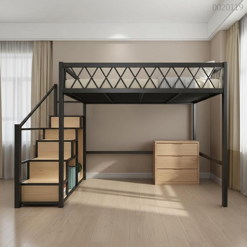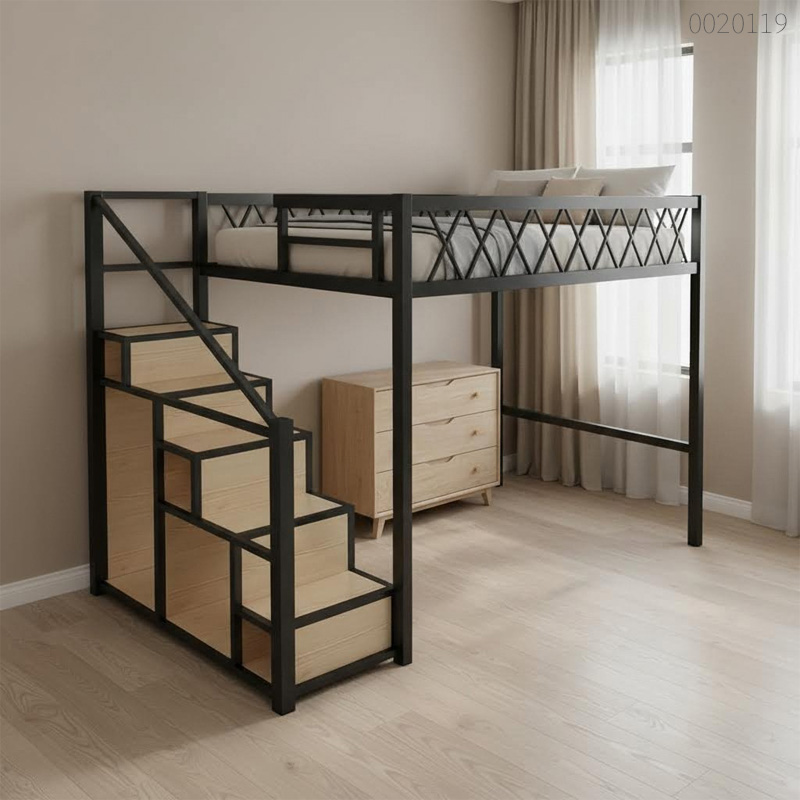 Giường sắt 1 tầng Niko giống như một giải pháp "xây thêm gác lửng" bằng sắt ngay trong phòng ngủ của bạn. Phía trên là nơi nghỉ ngơi an toàn với lan can X-cross chắc chắn, còn phía dưới là không gian gầm cao tới 1m7, cực kỳ rộng rãi để bạn đặt vừa vặn cả bàn làm việc lớn hay sofa thư giãn. Điểm khác biệt nhất chính là hệ thống cầu thang hộp vững chãi, mỗi bậc thang đều được tận dụng làm kệ sách hoặc hộc chứa đồ cực kỳ thông minh. Với khung sắt hộp dày dặn và lớp sơn tĩnh điện mịn màng, Niko không chỉ giải phóng diện tích sàn mà còn mang lại vẻ hiện đại, sành điệu cho căn phòng.
