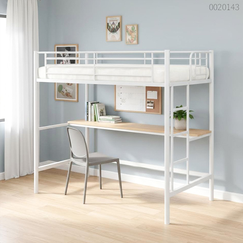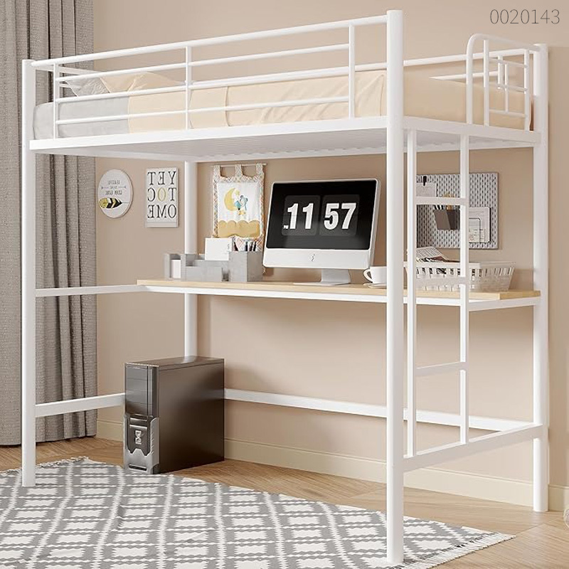 Mẫu giường Pora được thiết kế như một căn phòng hai tầng thu nhỏ với kết cấu sắt hộp kẽm và sắt ống phi 49 siêu chịu lực. Tầng trên là nơi nghỉ ngơi an toàn với lan can cao bao quanh, còn tầng dưới là không gian mở hoàn toàn với chiều cao gầm 1m7. Sự kết hợp này cho phép bạn đặt trọn bộ bàn làm việc dài hoặc sofa thư giãn ngay dưới gầm giường mà vẫn giữ được độ thông thoáng cho căn phòng. Các mối hàn được xử lý phẳng mịn, đi kèm hệ vạt nan sắt chắc chắn giúp nâng đỡ nệm tối ưu. Đây là mẫu giường thực dụng, giải quyết tốt nhu cầu sống và làm việc trong cùng một diện tích một cách bền bỉ.
