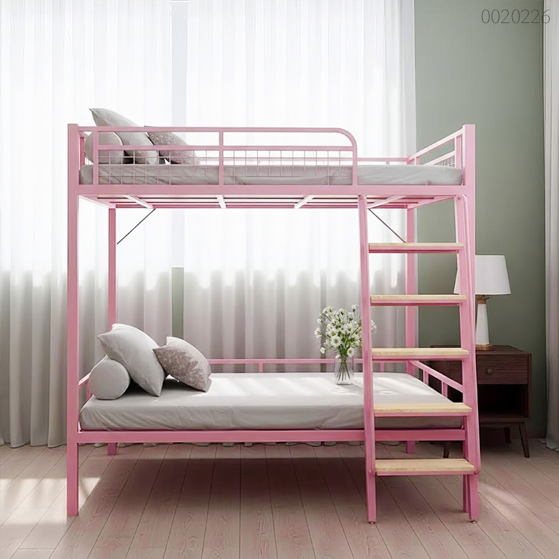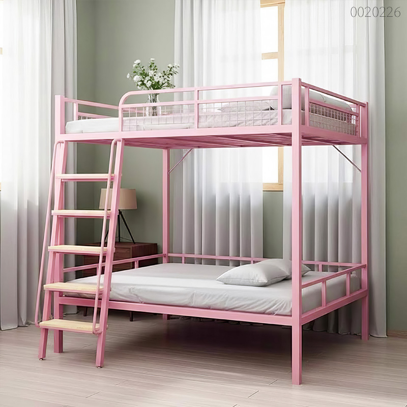 - Lựa chọn hàng đầu cho trẻ em và học sinh: Tông màu hồng Pastel dễ thương cùng hệ thống cầu thang bậc gỗ bản rộng có tay vịn tạo nên không gian ngủ cực kỳ an toàn và lôi cuốn cho các bé.