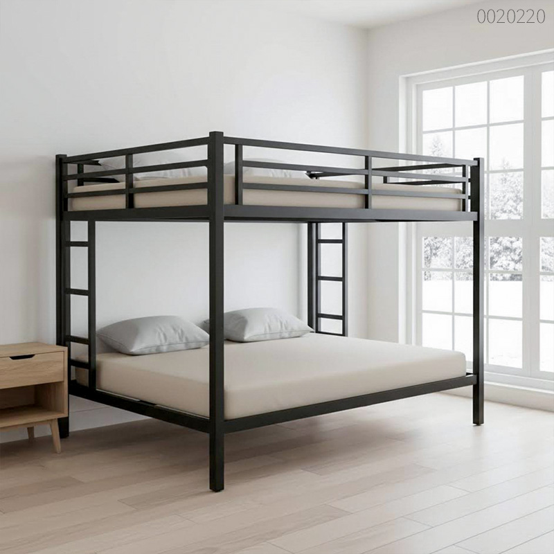 Giường sắt 2 tầng Yapi giải quyết tốt nỗi lo giường tầng bị rung lắc nhờ hệ khung sắt hộp 50x50mm dày dặn, chịu lực rất khỏe. Bạn sẽ thấy thoải mái khi leo trèo vì hai đầu giường đều tích hợp sẵn cầu thang, giúp lên xuống dễ dàng dù kê giường ở bất kỳ góc nào trong phòng. Thiết kế này giúp tiết kiệm không gian tối đa do không có cầu thang rời đưa ra ngoài. Tầng trên cực kỳ an toàn với hệ lan can ba nan cao bao quanh bốn mặt, giúp bạn ngủ ngon mà không sợ lăn ngã. Bề mặt giường phủ sơn tĩnh điện mịn màng, vừa dễ lau chùi vừa bền màu, rất phù hợp cho căn hộ nhỏ hay phòng trọ hiện đại.