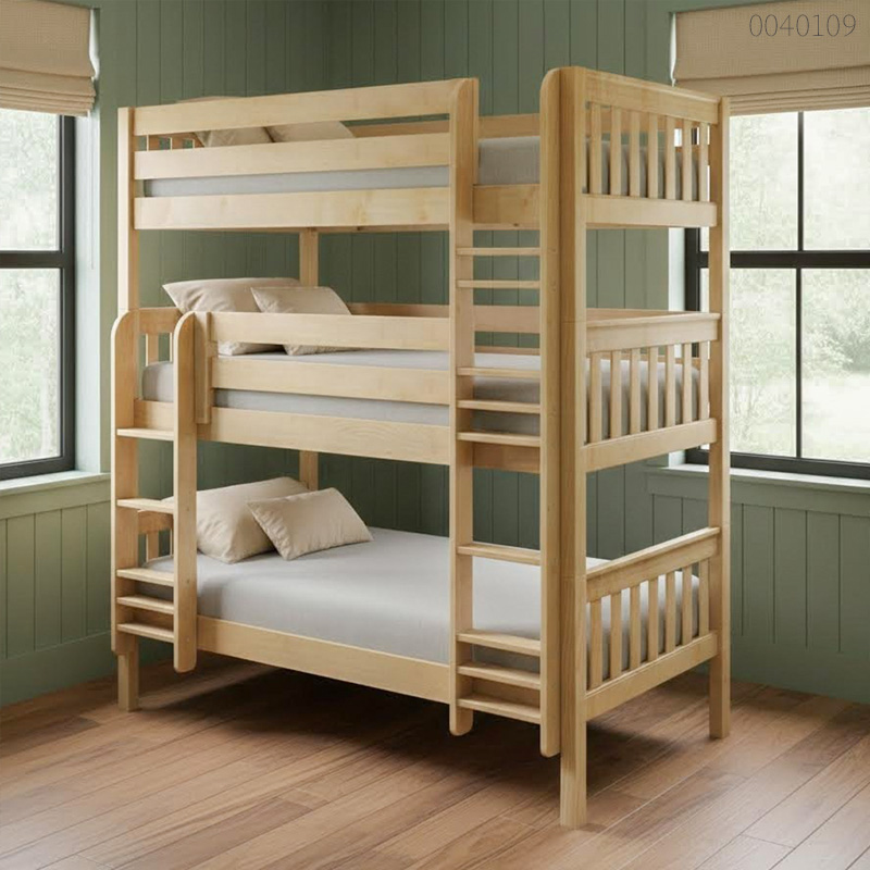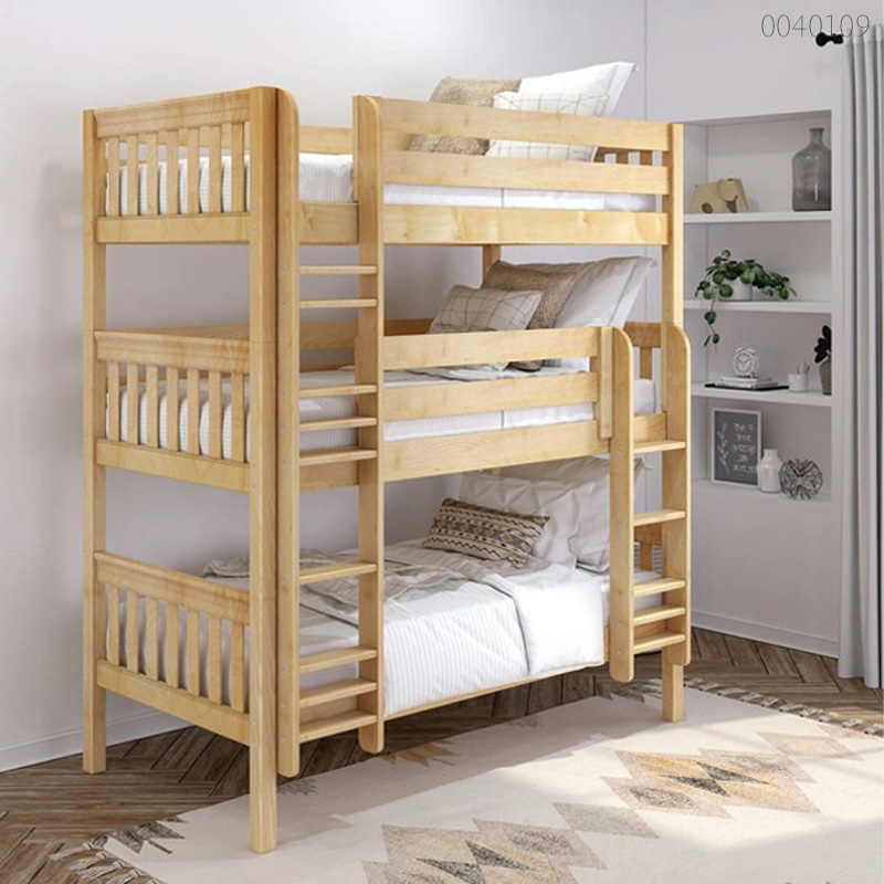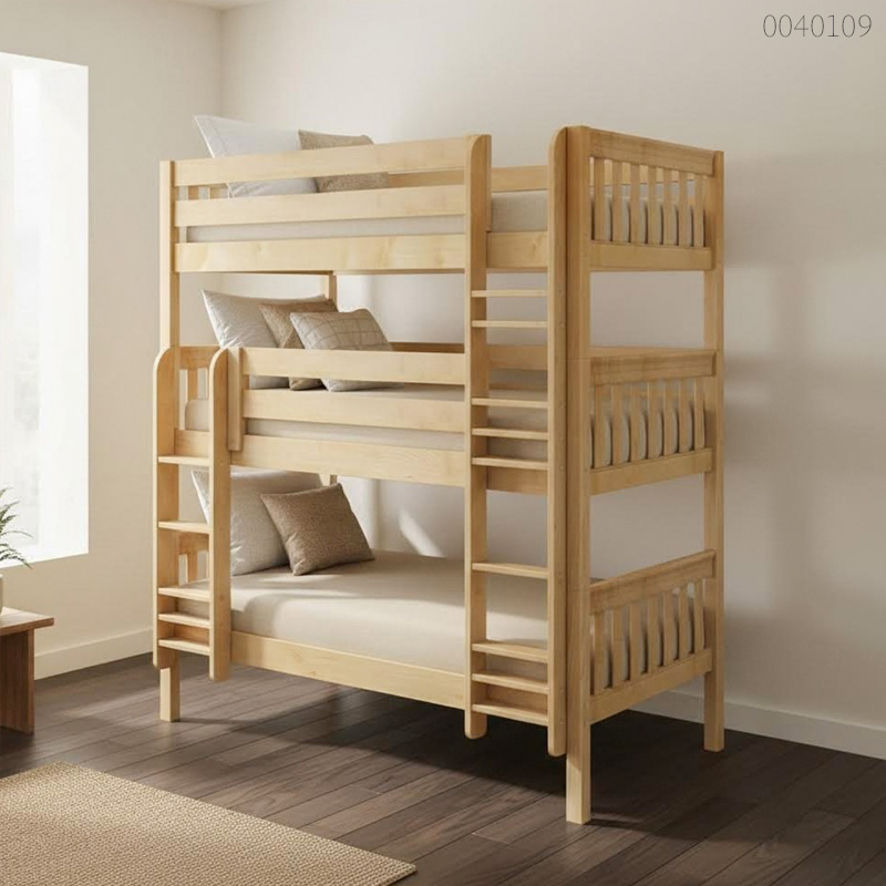 Giường tầng gỗ thông Levi giải quyết triệt để bài toán thiếu chỗ ngủ bằng cấu trúc ba tầng xếp chồng gọn gàng, tận dụng toàn bộ chiều cao sát trần nhà. Bốn chân trụ gỗ đặc bản lớn chạy xuyên suốt giúp khung giường luôn vững chãi, chịu tải tốt cho cả ba người lớn sử dụng cùng lúc. Thiết kế cầu thang kép gắn sườn tạo lối đi riêng biệt, giúp người ở tầng cao nhất di chuyển thoải mái mà không làm phiền người nằm dưới. Hệ nan dọc ở đầu giường và lan can giúp không khí lưu thông liên tục, xóa tan cảm giác bí bách. Bề mặt gỗ thông mịn màng với vân gỗ tự nhiên mang lại sự ấm áp, giúp phòng ngủ nhỏ luôn thông thoáng và ngăn nắp.