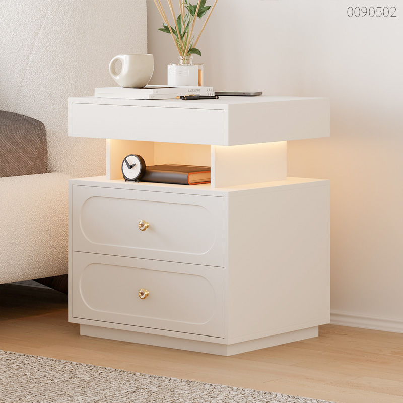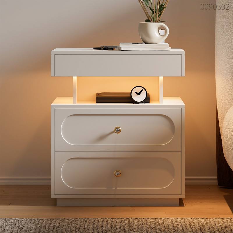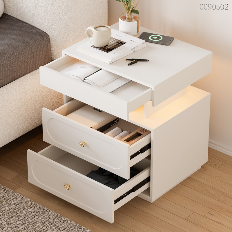 Tủ đầu giường gỗ công nghiệp Lego giải quyết triệt để nỗi lo dây cáp bừa bãi bằng trạm sạc không dây hiện đại ngay trên mặt bàn. Thiết kế phân tầng độc đáo với trụ gỗ trung tâm tạo khoảng hở thoáng đãng, giúp phòng ngủ thêm rộng rãi thay vì cảm giác chật chội của các khối tủ đặc. Sự tỉ mỉ thể hiện rõ qua mặt ngăn kéo phay oval bằng máy CNC, kết hợp cùng tay nắm kim loại đính đá lấp lánh như món trang sức cho không gian. Không chỉ đẹp, tủ sở hữu 3 ngăn kéo cùng kệ hở tiện lợi, đủ sức chứa từ kính mắt đến máy tính bảng ngay sát mép giường. Hệ thống đèn LED cảm ứng hắt sáng nhẹ nhàng giúp bạn định vị trong đêm mà không lo chói mắt. Cốt gỗ MDF chống ẩm và mạch điện niêm phong kỹ giúp bạn ngủ ngon, tin tưởng tuyệt đối vào độ bền.