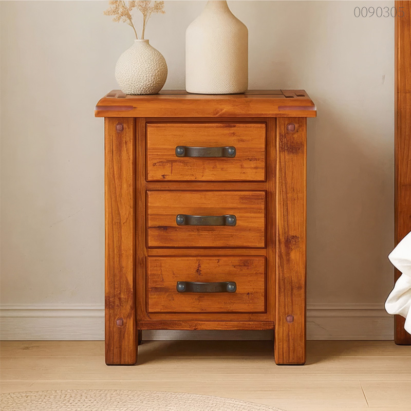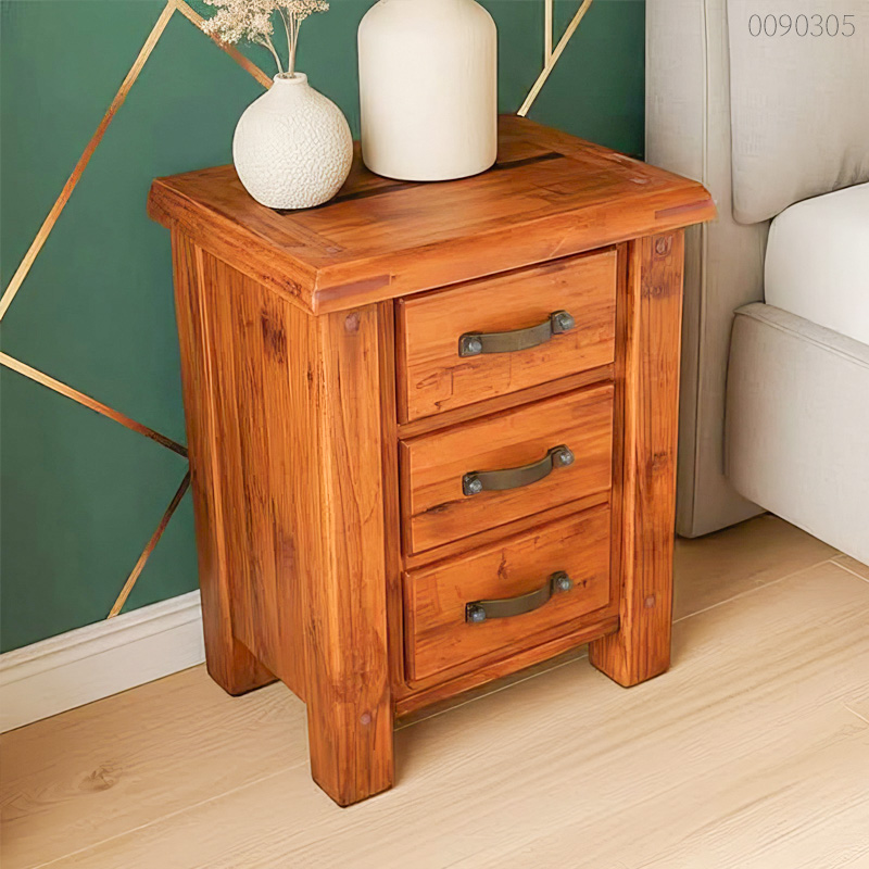 Tủ đầu giường gỗ tràm Giro sở hữu cấu trúc hình khối vững chãi với kích thước tiêu chuẩn 57x43x66cm, nổi bật nhờ sự kết hợp tinh tế giữa nét đẹp mộc mạc và tư duy thiết kế hiện đại. Điểm đặc trưng riêng biệt của mẫu tủ đầu giường này nằm ở hệ thống 3 ngăn kéo rộng rãi với tay nắm kim loại giả cổ, cùng phần đỉnh tủ được bo tròn cạnh nhẹ nhàng giúp triệt tiêu góc nhọn nguy hiểm. Vai trò của cấu trúc tổng thể không chỉ tối ưu hóa khả năng lưu trữ mà còn ngầm khẳng định giá trị thẩm mỹ bền vững, sẵn sàng đáp ứng mọi nhu cầu từ trưng bày đèn ngủ đến bảo quản đồ cá nhân kín đáo.